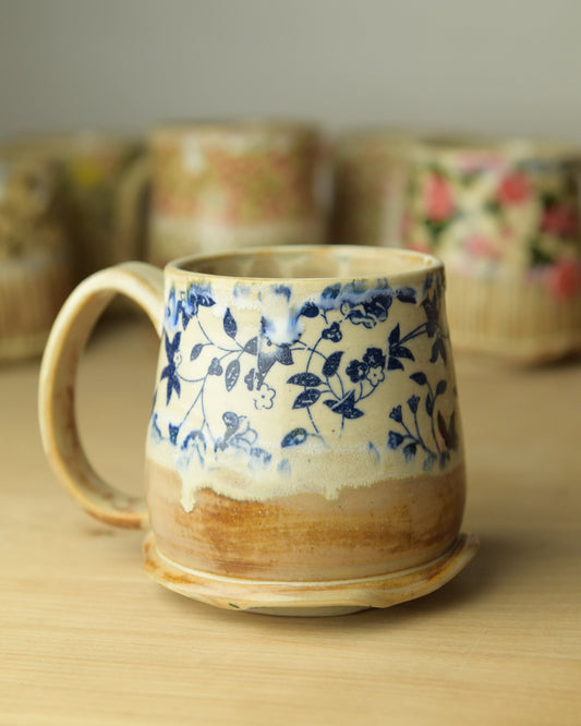 Wheel Thrown Pottery - Cozy Cottage Blue Floral Vine Mug