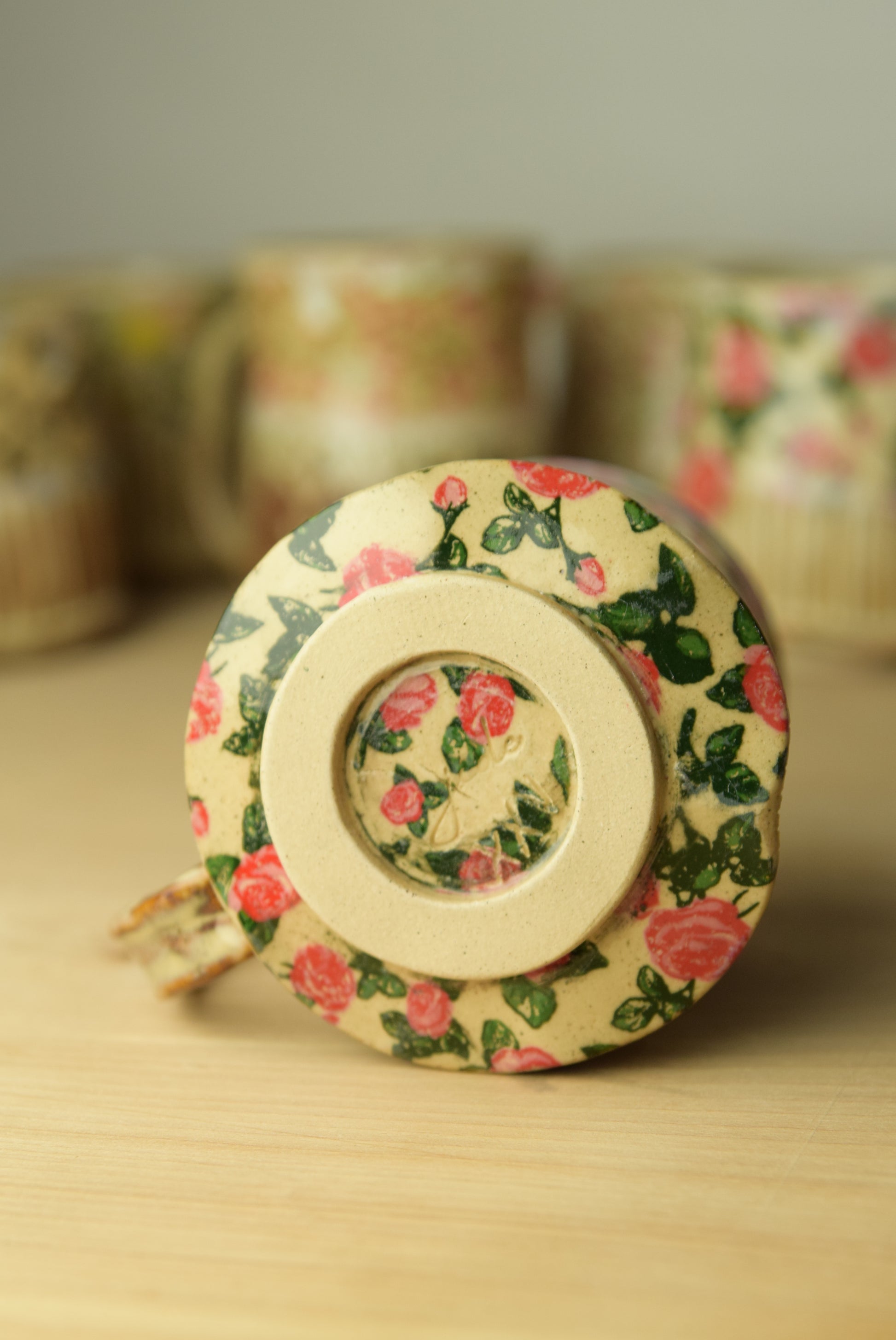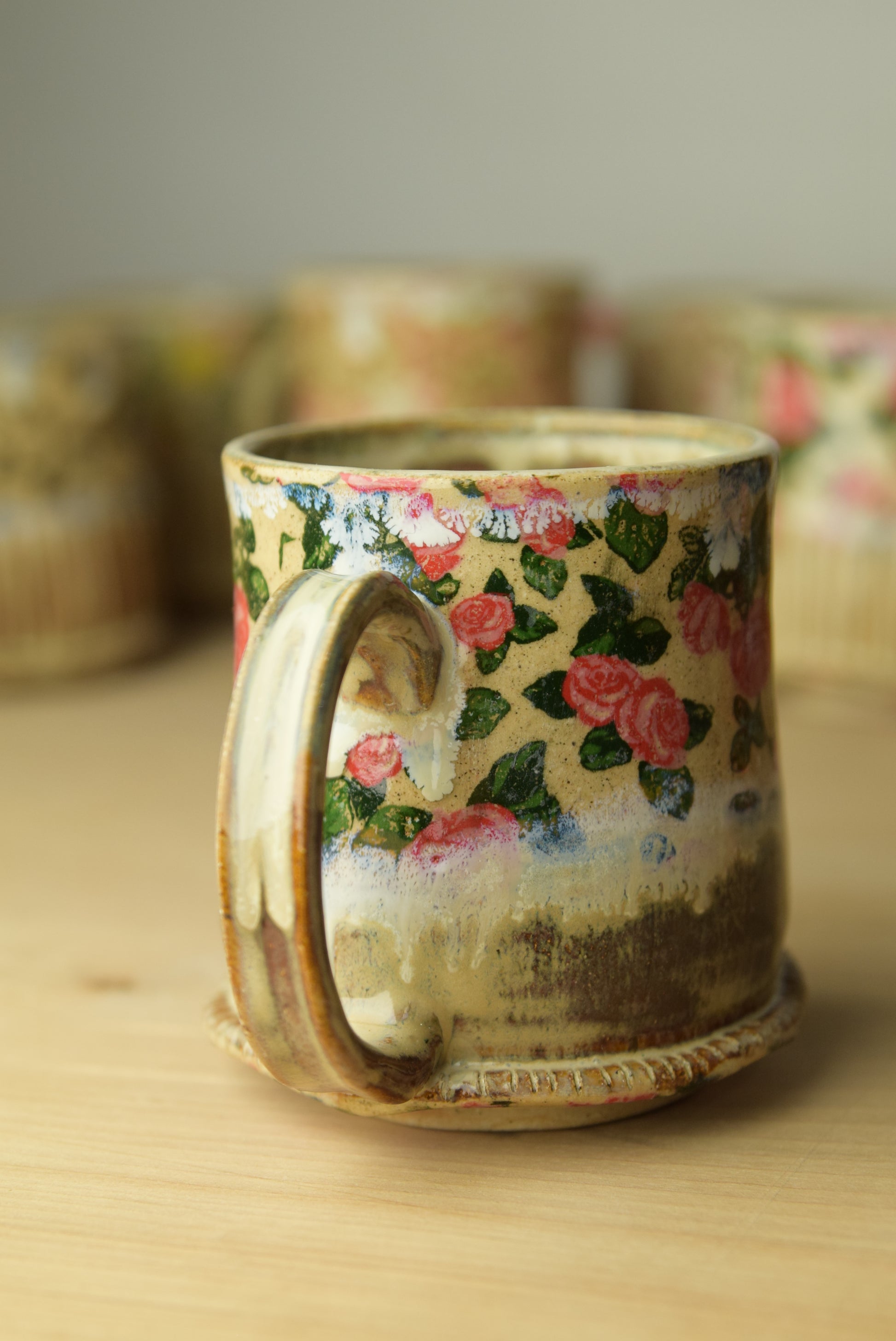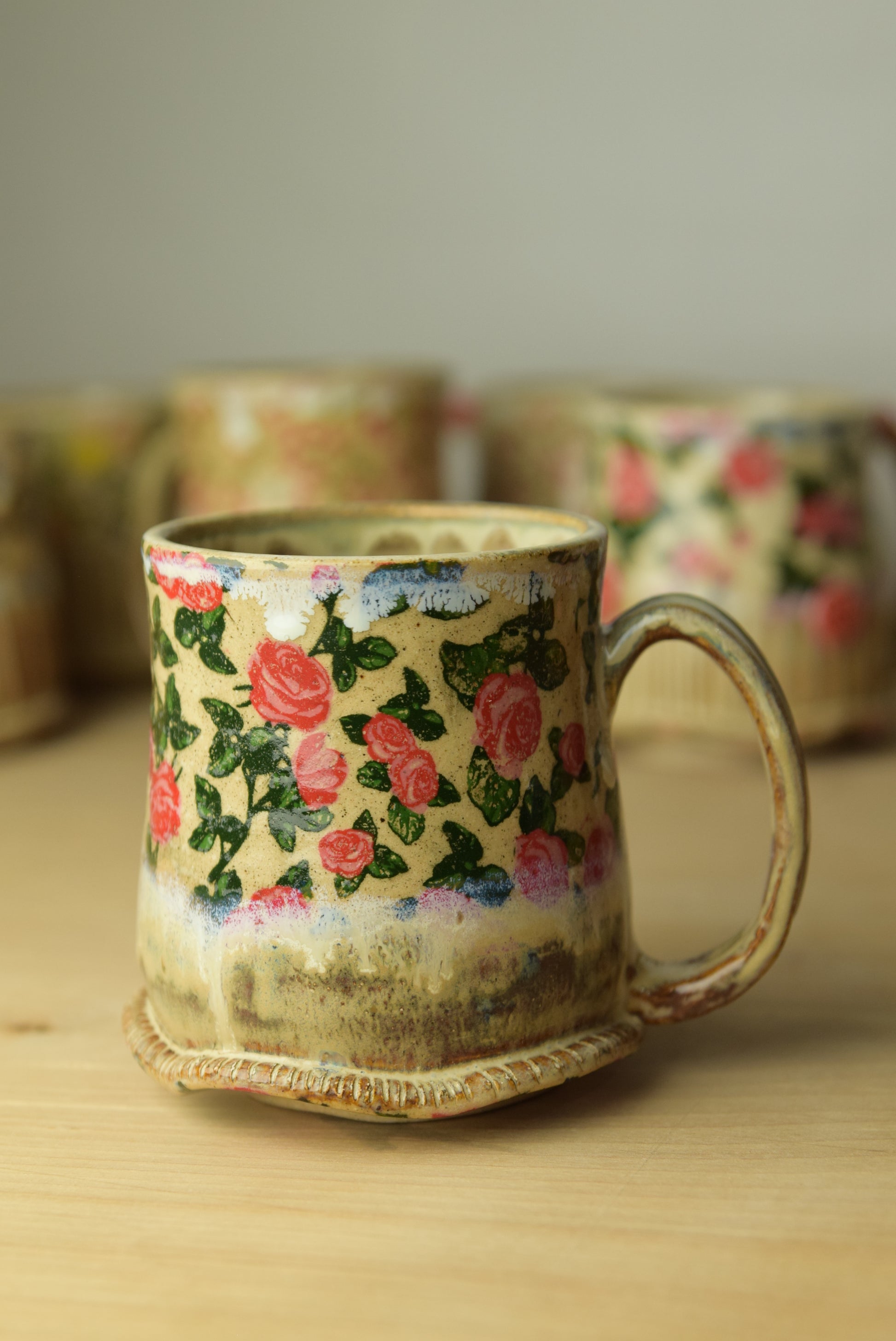 Wheel thrown and hand altered rustic cottage style mug with red roses. Crafted in a "modern antique" style.